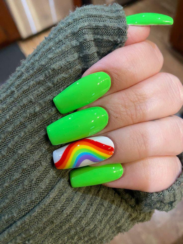 This design features bright green glossy nails with a single accent nail showing a soft rainbow wave. The overall look feels playful and modern, with a bold green base balanced by a fun but minimal St. Patrick’s Day accent.