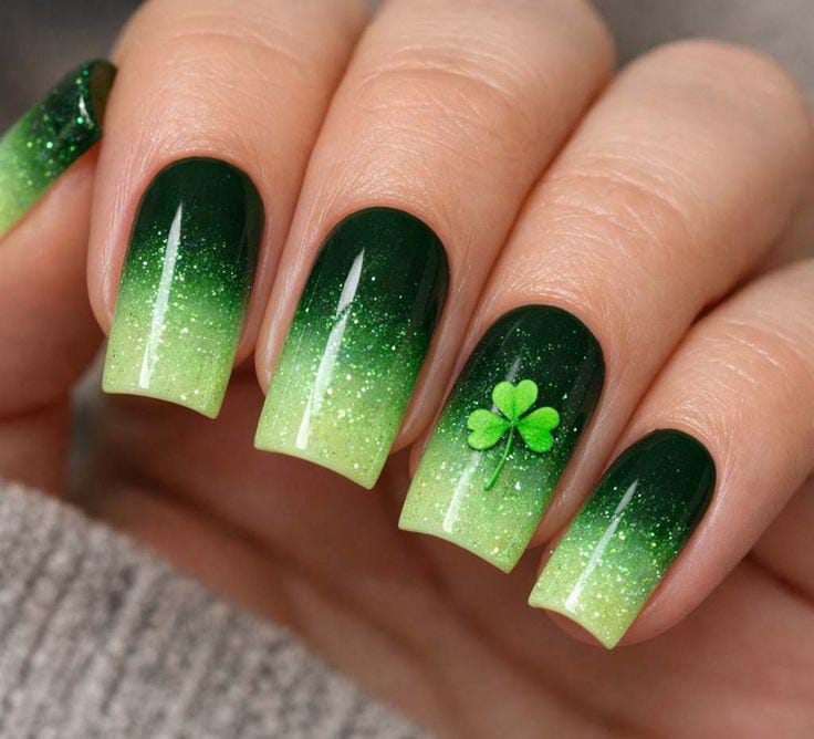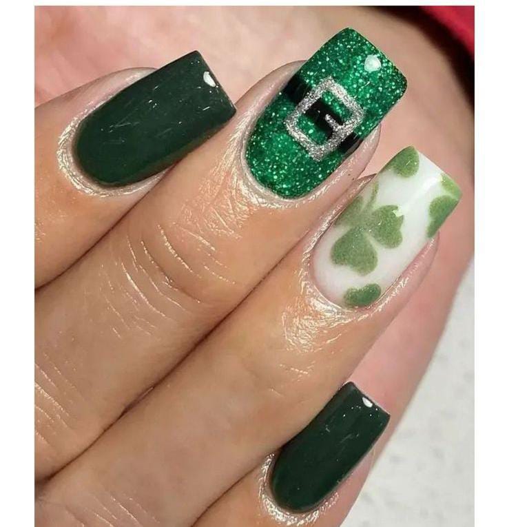 Deep green tones mix with soft glitter and a small clover nude accent for a gentle St. Patrick’s holiday feel. The vibe is festive yet subtle, with just enough sparkle to catch the eye.
