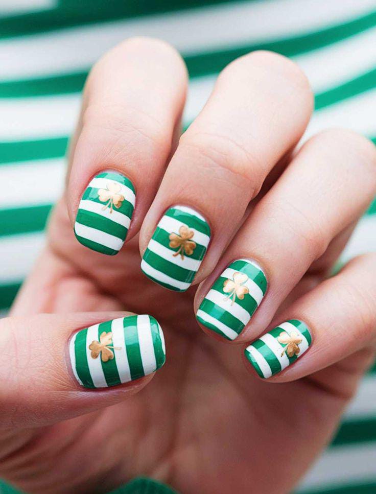 A clean mix of rich green and white polish creates a fresh, St. Patrick’s Day style. The simple shamrock detail and soft striping give it a refined, subtle festive touch that still feels everyday-friendly.