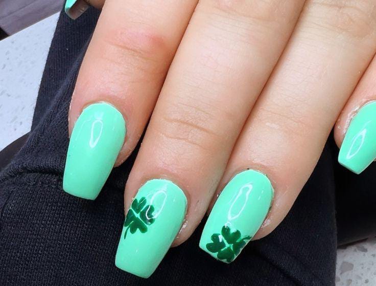 Fresh mint green nails with simple dark green clover accents feel bright and clean. The design is subtle, cheerful, and perfect for a soft St. Patrick’s Day look without going over the top.