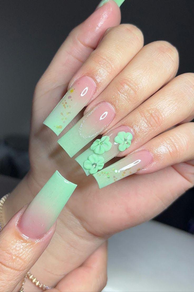 Soft mint green fades into a natural pink base, creating a fresh and airy feel. The tiny floral-like clover, gemstone details and light shimmer keep it cute, springy, and perfect for a subtle St. Patrick’s holiday touch.