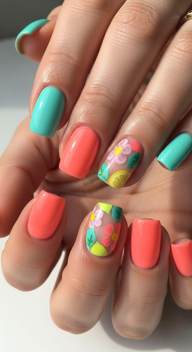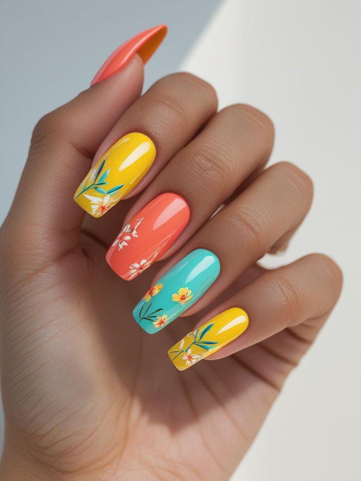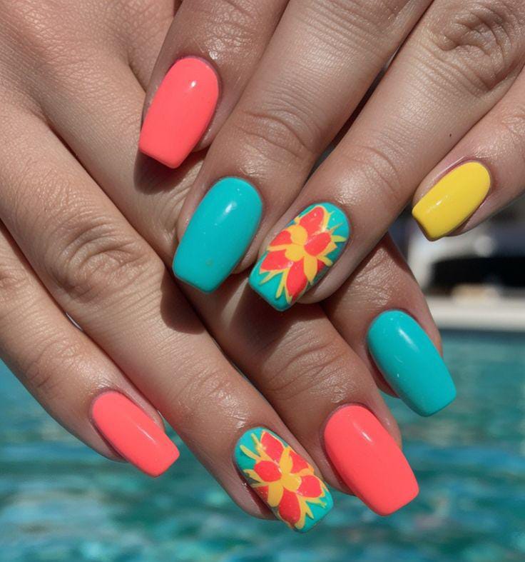 Coral nails are paired with turquoise and yellow accents, creating a bold, summery color mix. The floral details give it a lively, poolside feel that’s bright, cheerful, and eye-catching.