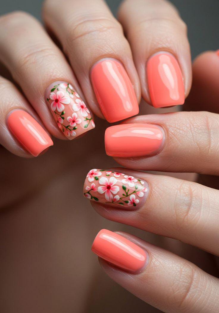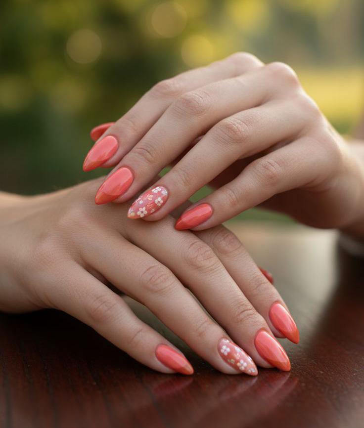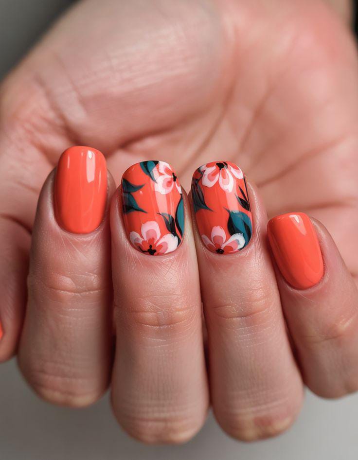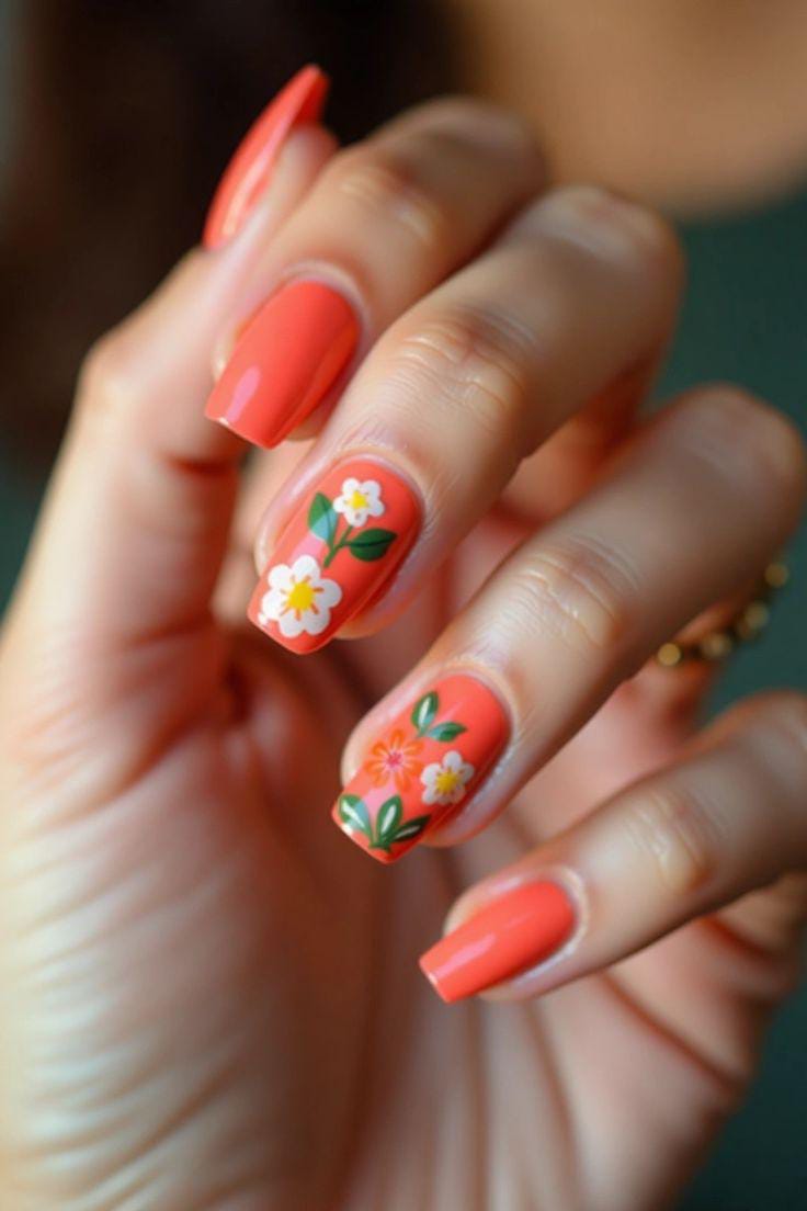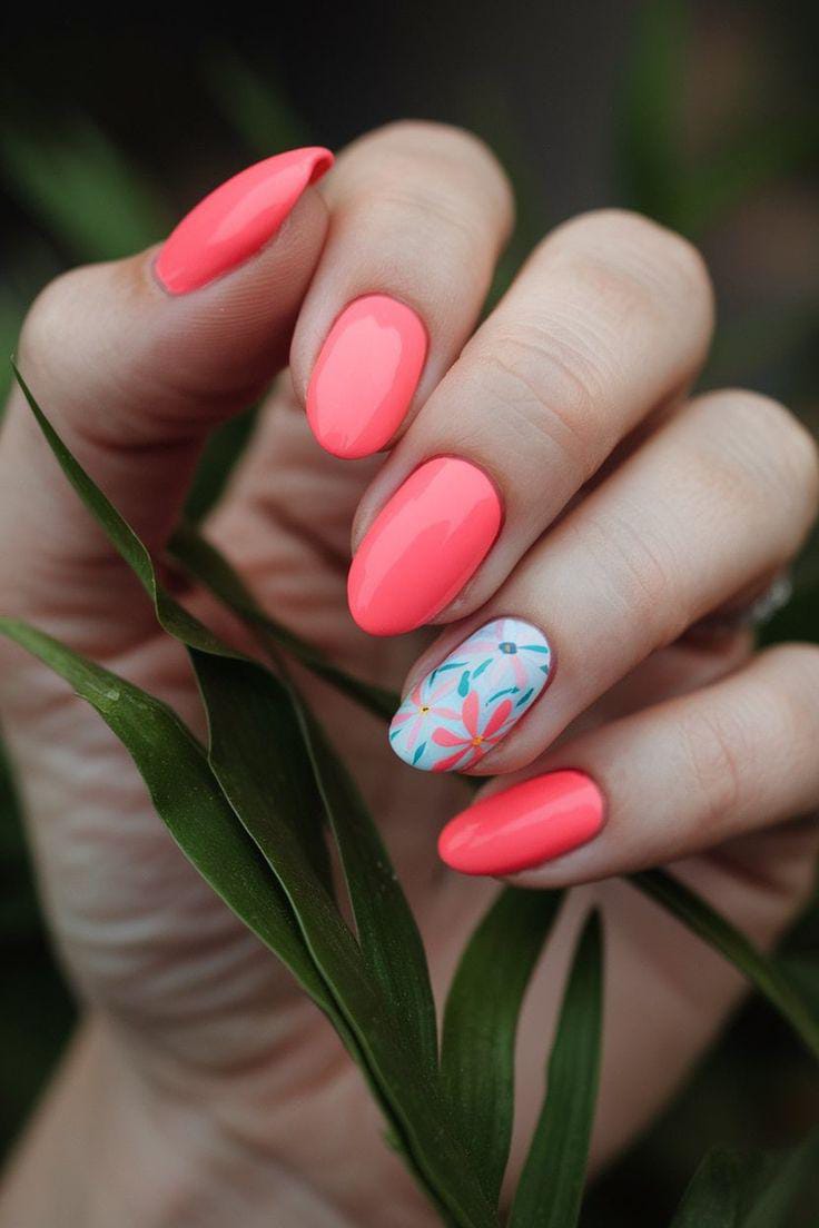These nails mix a smooth coral finish with a single white accent nail showcasing a colorful floral pattern. The design gives off a relaxed tropical summer vibe while still looking polished and stylish.