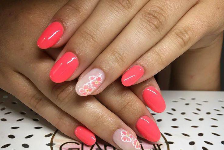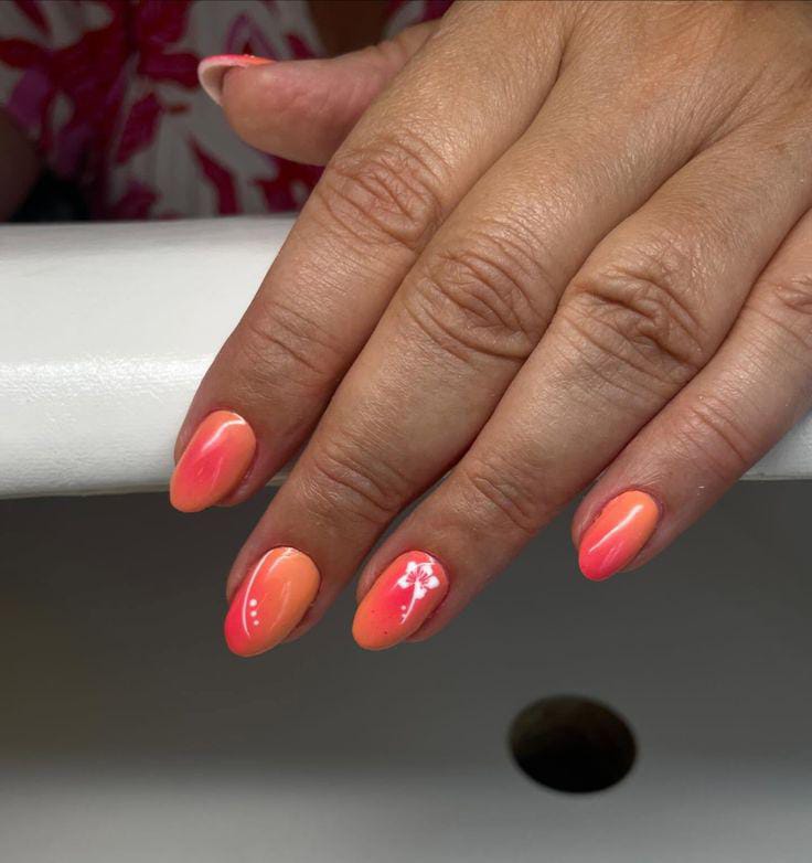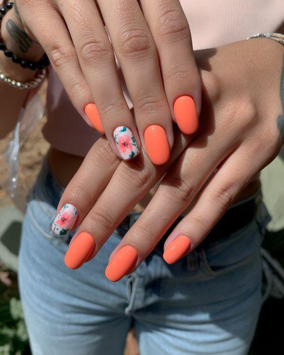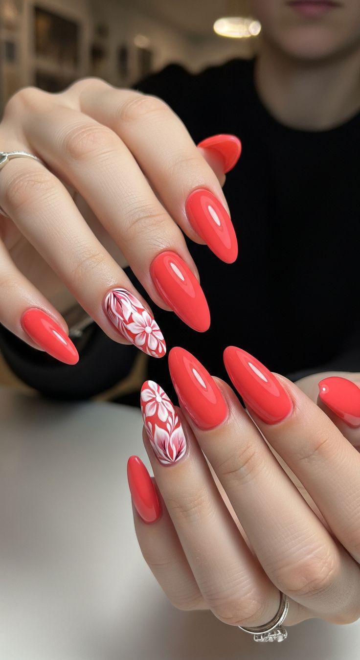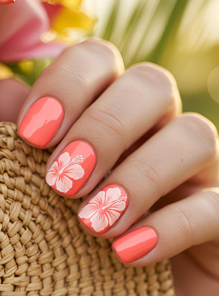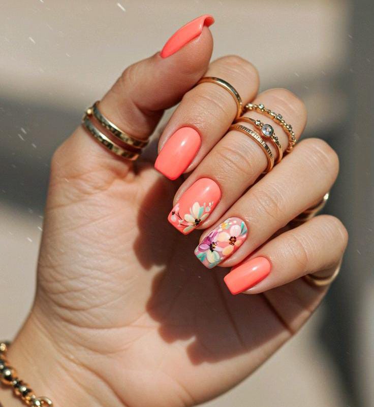 These nails mix a smooth coral finish with a single white accent nail showcasing a colorful floral pattern. The design gives off a relaxed tropical summer vibe while still looking polished and stylish.