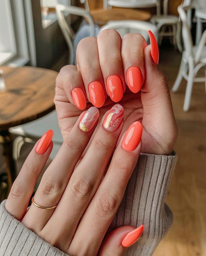 A sleek coral manicure is paired with minimal abstract-like marble style and gold foil accents for a modern summer style. The glossy finish and soft detailing keep the design stylish, fresh, and effortlessly chic.