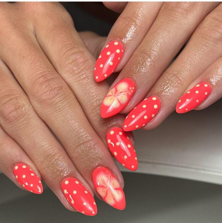 This design features bright coral nails with playful white polka dots and a soft floral accent. The overall look feels cheerful, youthful, and perfect for a fun summer vibe.