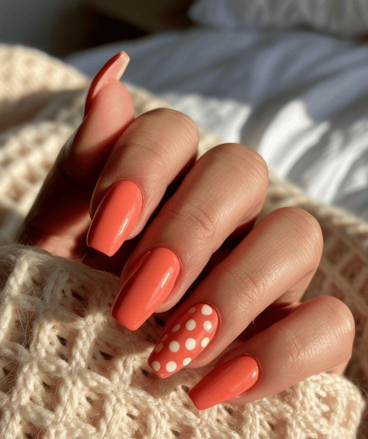 A smooth peachy-coral base is paired with a single polka dot accent nail for subtle charm. It gives off a cozy, relaxed summer feel with a touch of sweetness.