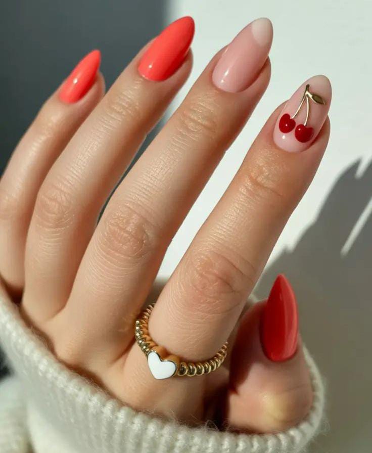 Glossy coral nails are mixed with a sheer nude accent featuring tiny cherry art. The design feels fresh, cute, and slightly retro, making it a standout summer look.