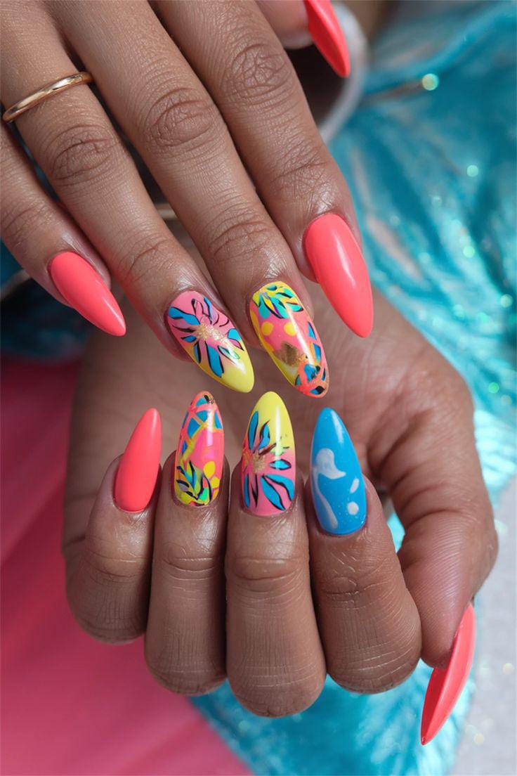 Bold coral nails are paired with vibrant blue and yellow accent nails featuring colorful, abstract floral patterns and subtle shimmer touch. The mix of neon shades and artistic details creates a fun, energetic summer look that feels beachy and expressive.