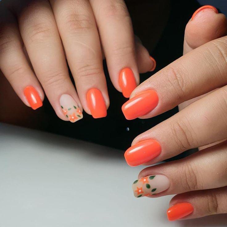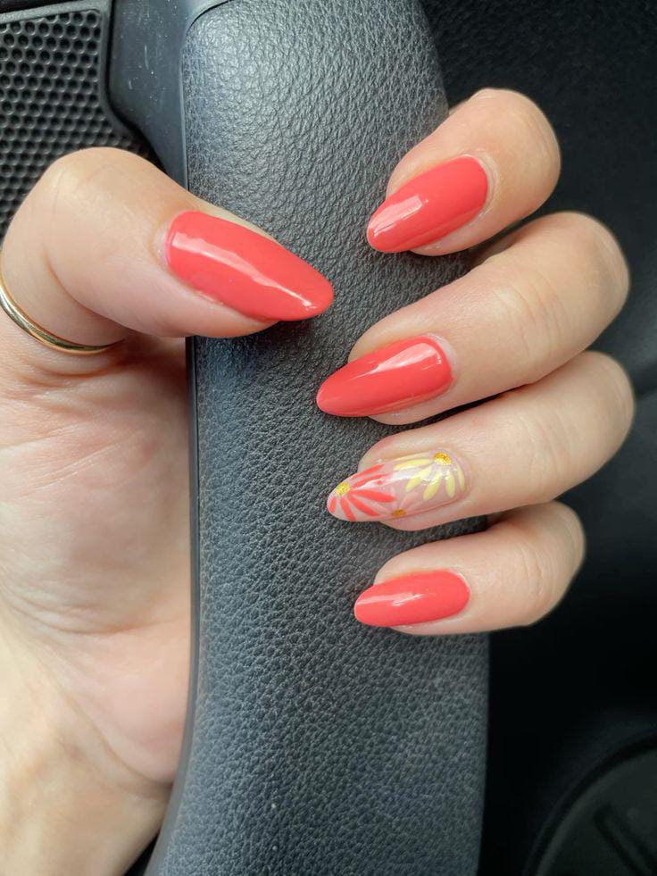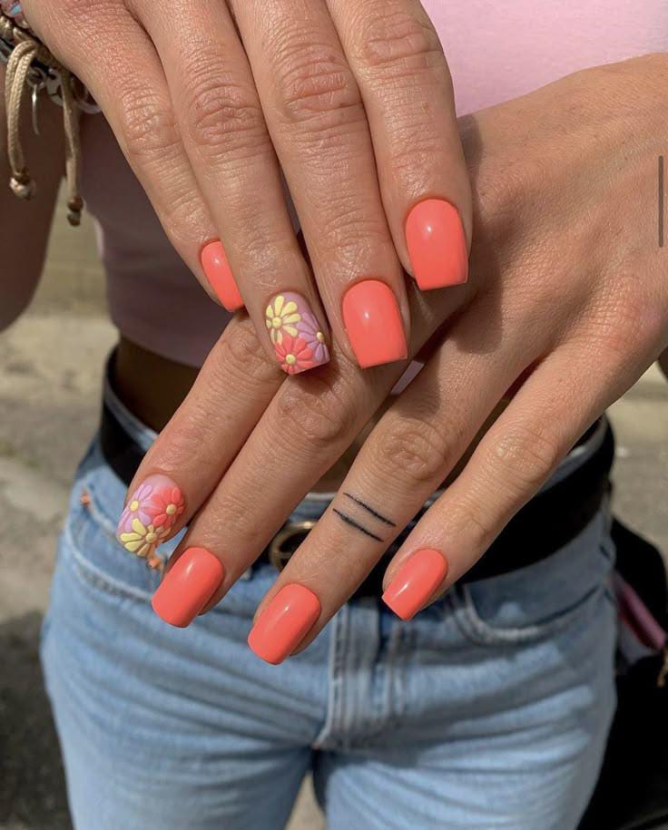 These nails showcase a vivid coral color alongside a cute floral nude accent nail. The overall vibe is cheerful and youthful, perfect for a fun and carefree summer look.