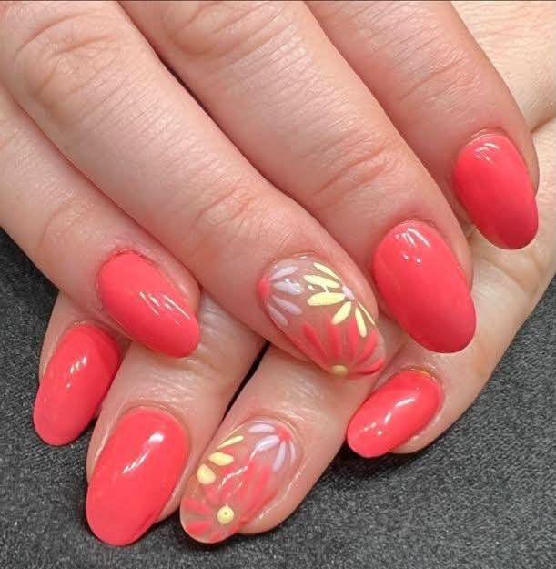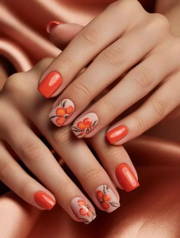 These nails combine bold coral with sheer accent nails decorated with abstract floral patterns. The style feels modern and artistic, giving a trendy twist to classic summer florals.