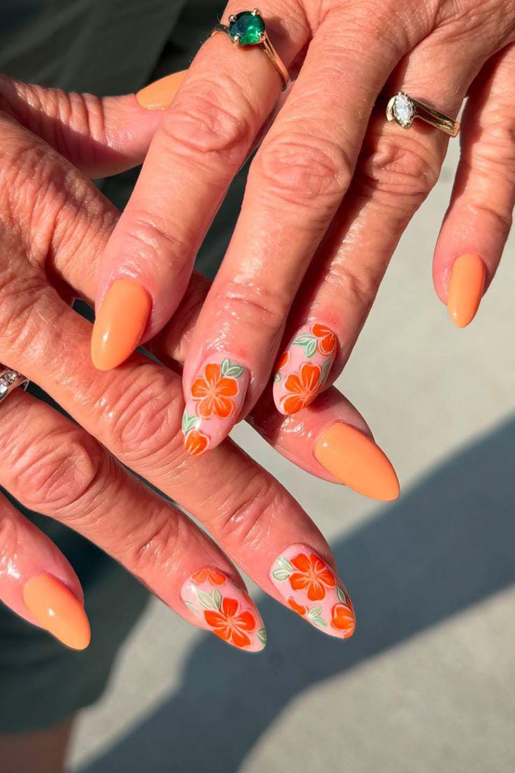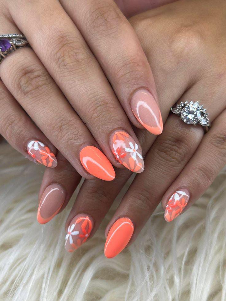 These almond-shaped nails feature a soft coral base paired with hand-painted floral accents in bright orange and leafy green. The overall look feels fresh, feminine, and perfect for sunny summer days.