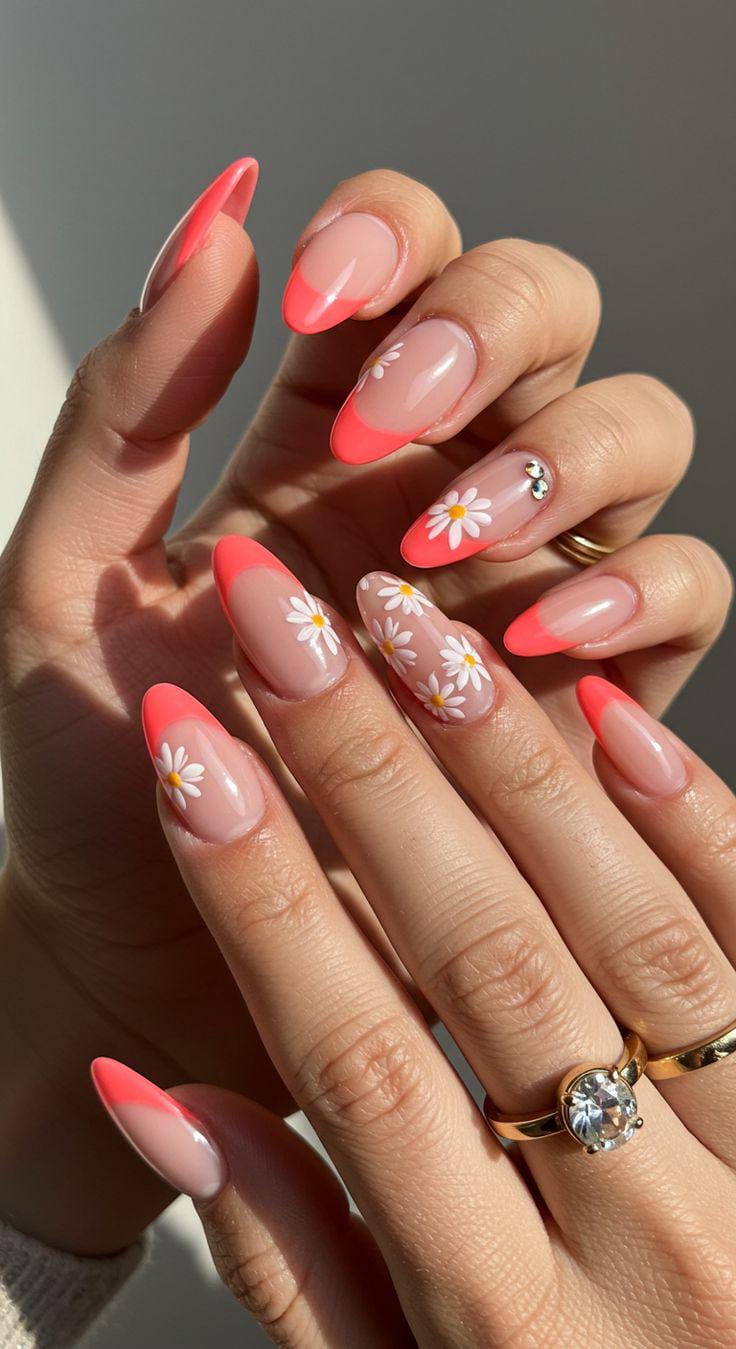A modern twist on the classic French manicure, these nails showcase coral-tipped edges over a sheer nude base. Delicate white daisy flowers add a playful, lighthearted summer charm.