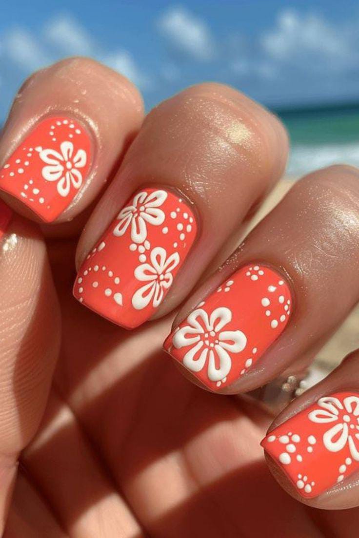 This design pairs vibrant coral polish with cute white raised daisy accents for a fresh, tropical feel. The overall vibe is fun, youthful, and perfect for sunny summer days or vacation looks.
