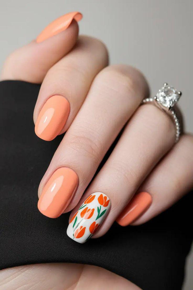 This manicure features a smooth coral finish paired with a single floral white accent nail showcasing simple tulip-inspired patterns. The overall style is minimal yet elegant, with a soft, cheerful summer feel.