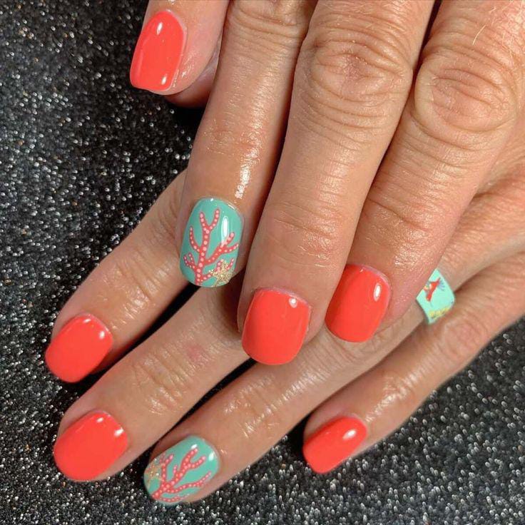 This design mixes bright coral nails with soft mint accent nails featuring coral-branch patterns. The contrast feels fresh and beachy, giving off an elegant tropical vibe that’s perfect for summer getaways.