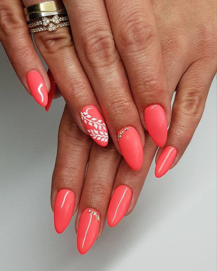 This set features vibrant coral almond-shaped nails with subtle white leaf detailing and small crystal accents. The design feels polished and classy, blending bold summer color with refined nail art.