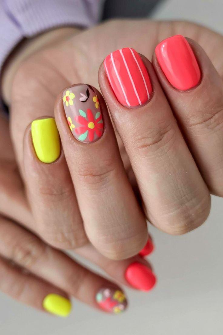Bright coral nails are mixed with cheerful yellow and a floral accent nail on a neutral base. The playful colors and simple patterns give this design a fun, youthful summer energy.
