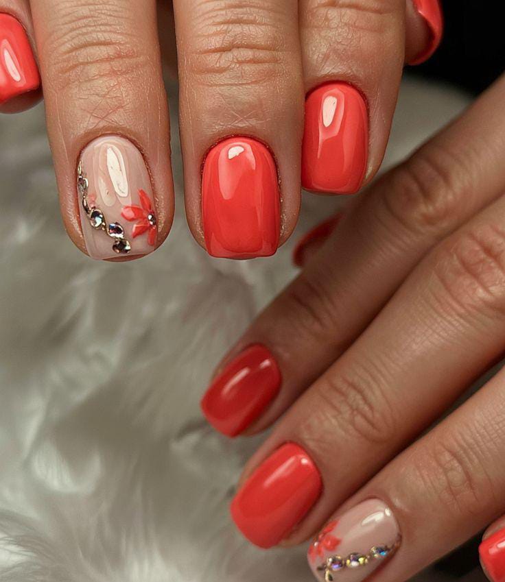 This design combines glossy coral nails with a delicate nude accent decorated with tiny flowers and subtle embellishment. It has a polished, elegant summer vibe that feels perfect for both casual days and special occasions.
