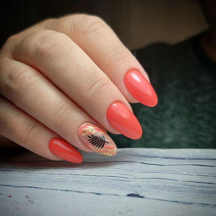 A sleek coral shade is balanced with a single accent nail featuring a simple black leaf and gold foil design over a nude base. The look is modern and clean, adding a calm, stylish twist to a bold summer color.
