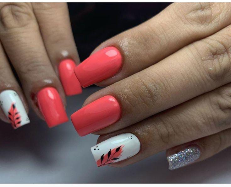 This set features glossy coral nails with minimal white accent nails highlighted by soft coral leaf and dot designs. The overall style is clean and modern, adding a subtle artistic summer touch without overpowering the look.