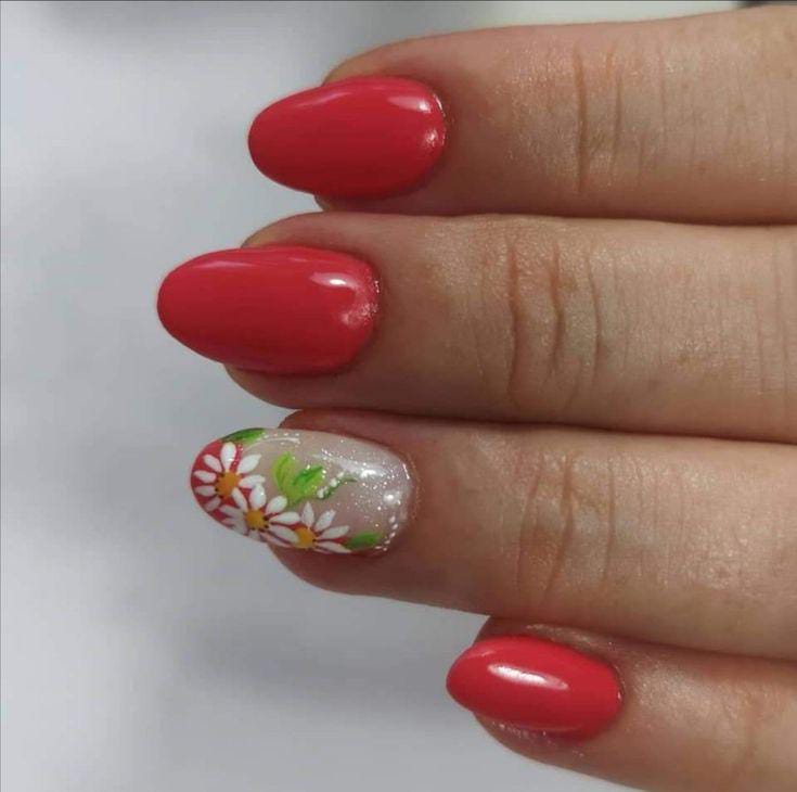 Bold coral nails are paired with a soft, glittery accent nail decorated with delicate daisies. The look balances brightness with summer elegance, making it great for both daytime and evening wear.