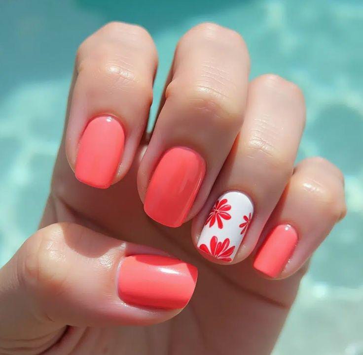 This design combines bright coral nails with a white accent nail featuring red floral prints. The overall vibe is clean, sunny, and refreshing—perfect for beach days and summer vacations.