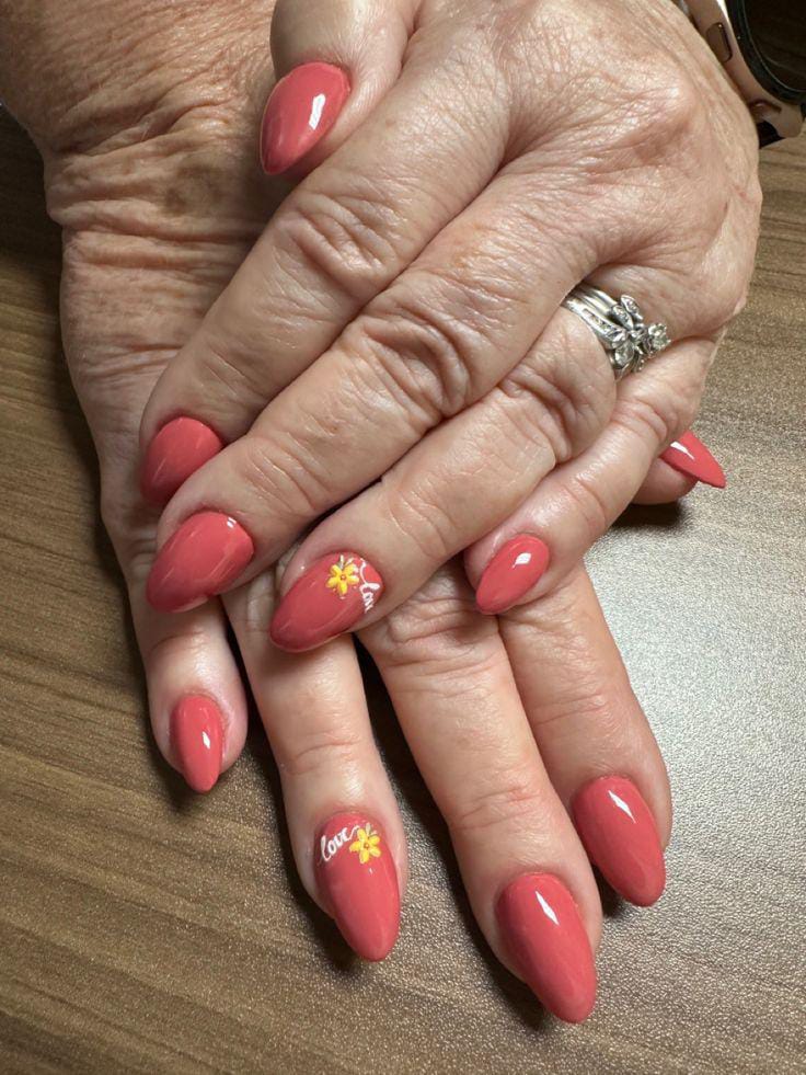 These nails feature a warm coral base with a glossy finish that feels bright and feminine. Simple floral and lettering accents on a couple of nails add a soft, cheerful touch, making the look elegant yet playful for summer.