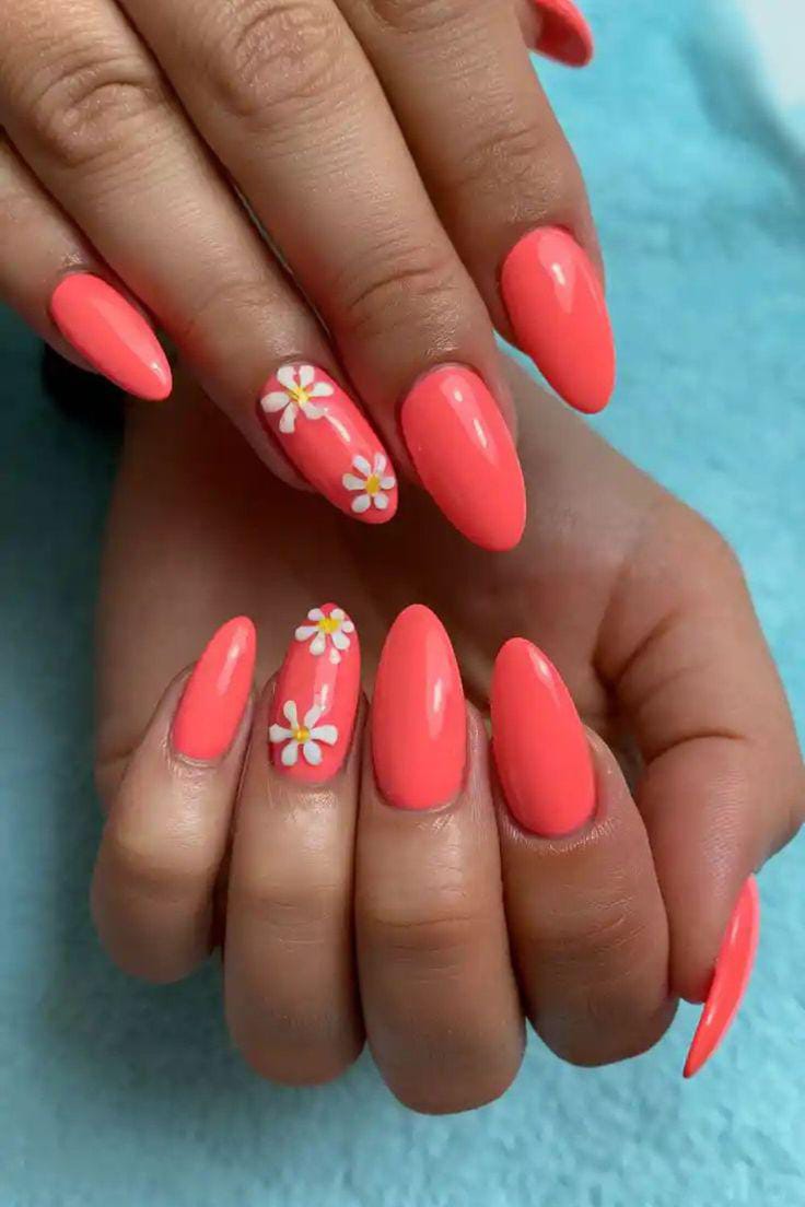 A glossy coral pink manicure is elevated with simple daisy details on accent nails. The combination feels playful and youthful, perfect for warm days and casual summer outfits.