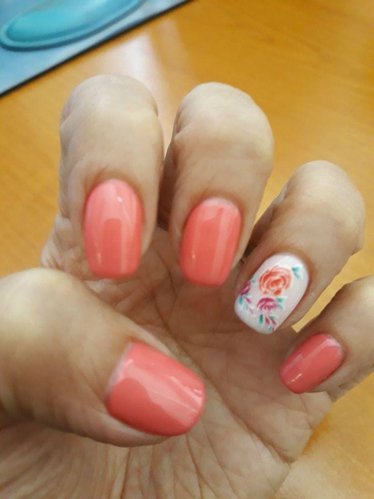A smooth coral shade is balanced with a delicate floral accent nail featuring soft rose details. The design feels gentle, classy, and ideal for those who want something subtle but still summery.