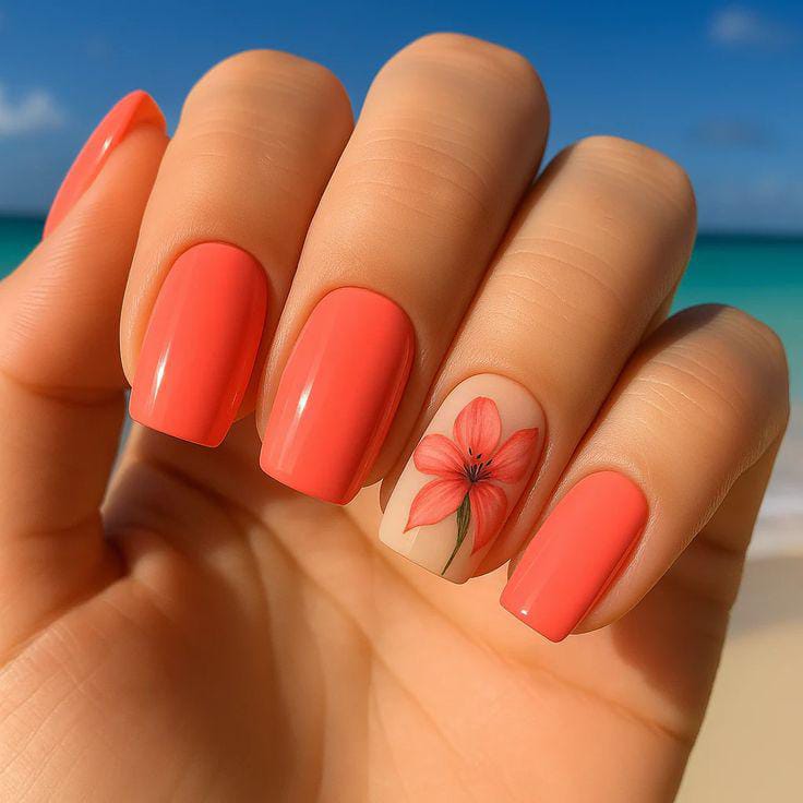 Smooth coral nails are paired with a delicate floral accent on a neutral base. The soft flower detail adds a romantic, summery charm that feels effortless and perfect for warm beach evenings.