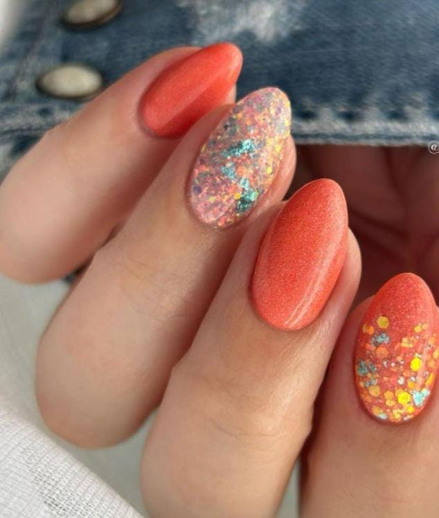 A rich coral base is mixed with glittery accent nails that catch the light beautifully. This design has a lively, celebratory vibe, perfect for summer parties or adding a little extra sparkle to everyday wear.