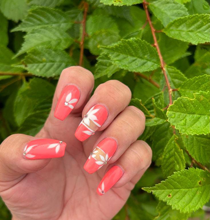 Bright coral nails are mixed with delicate white floral details, giving this look a clean yet tropical feel. The subtle rhinestones keep it polished while still feeling light and beach-ready summer aesthetic.