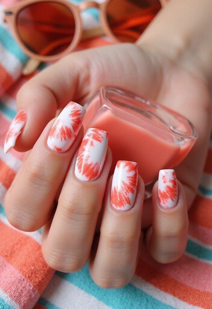 This design blends coral with soft white in a splashy, tie-dye style pattern. It has a relaxed, artsy summer vibe that feels fun, casual, and a little playful.