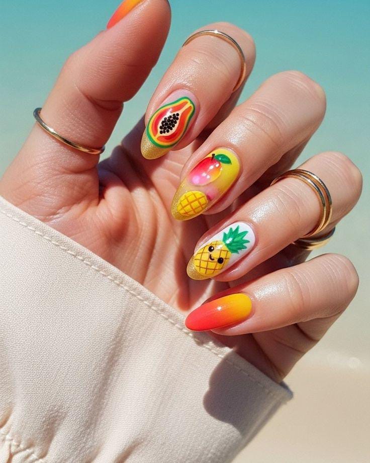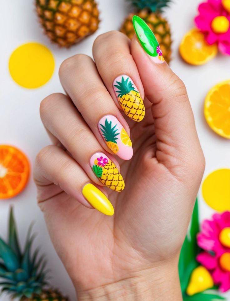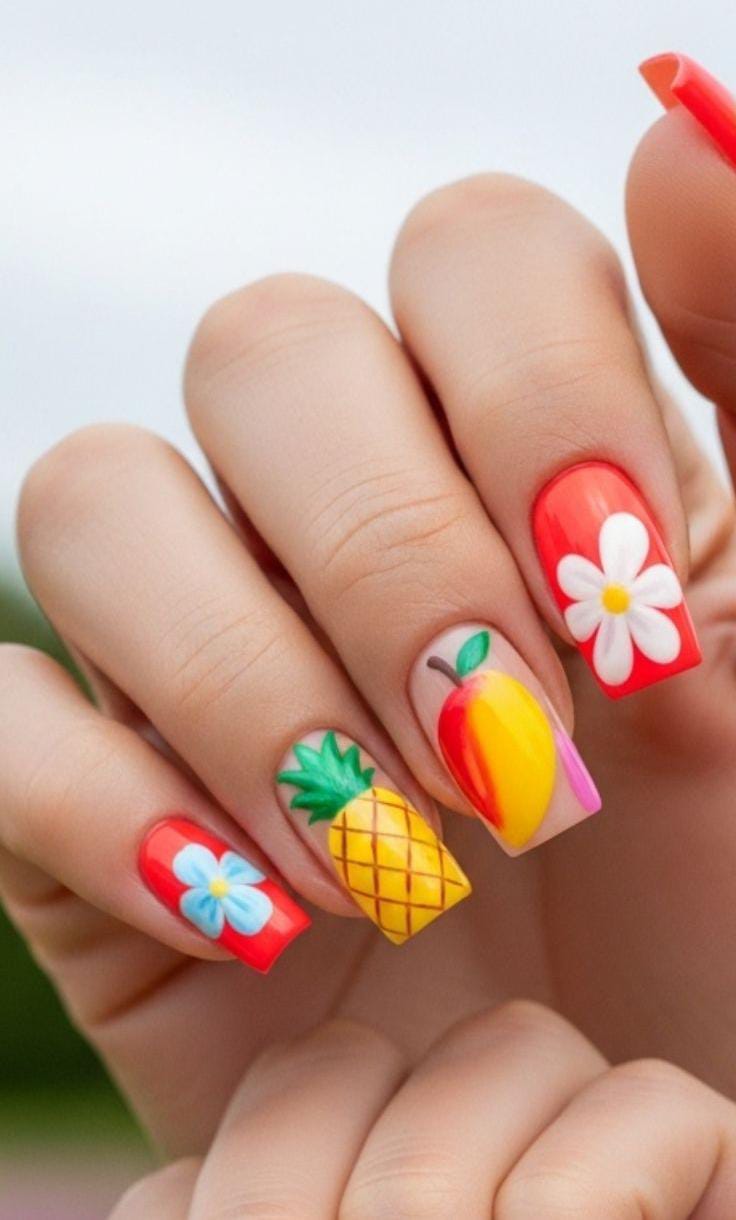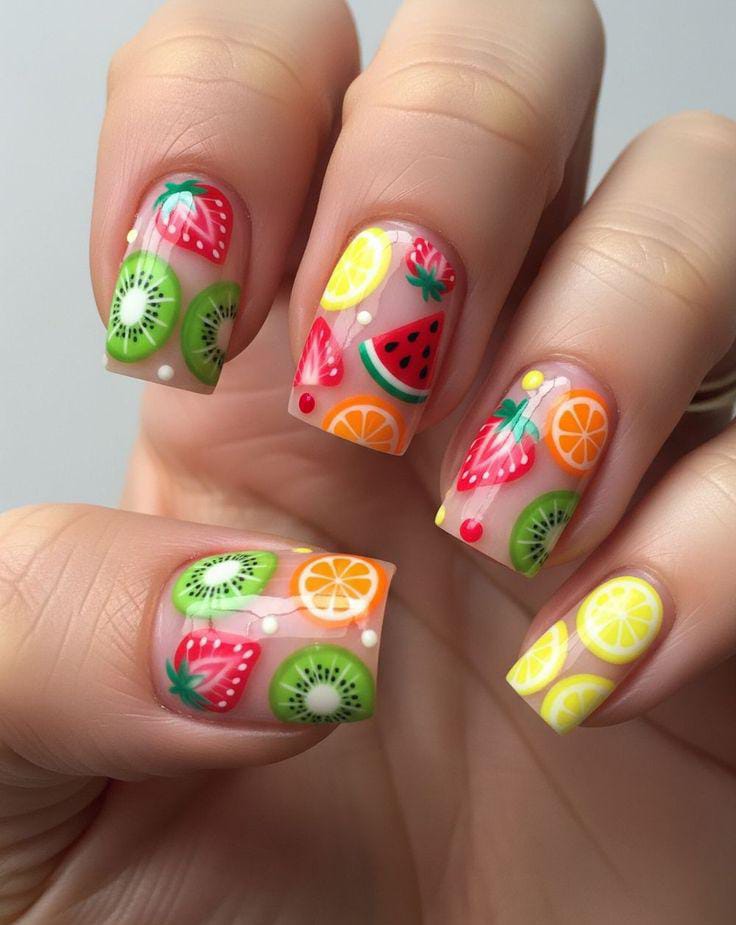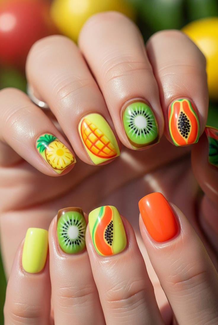 This square-shaped manicure combines bold neon shades with detailed fruit art like kiwi, papaya, and pineapple. The bright green, orange, and yellow tones create a vibrant, juicy summer look that feels energetic and tropical.