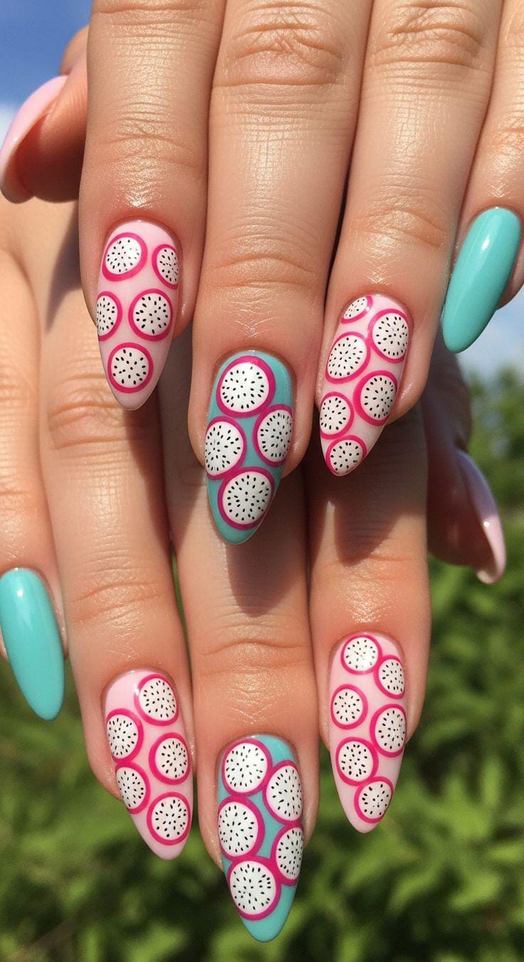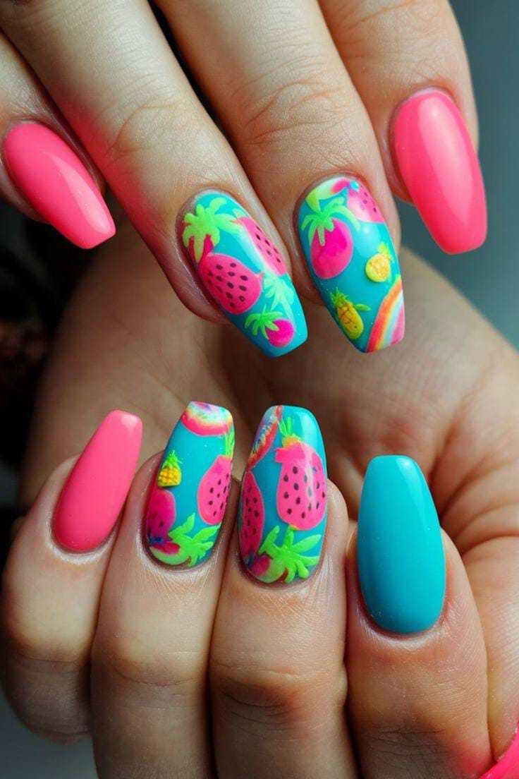 Long coffin nails alternate between hot pink and turquoise bases with dragon fruit designs and greenery. The bright, contrasting colors give off a fun, poolside-ready summer vibe that’s playful and eye-catching.