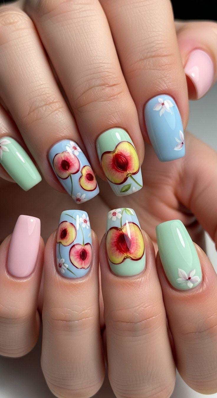 This design features soft pastel shades like baby blue, mint green, and blush pink paired with delicate peach illustrations. The sliced peach fruit art with tiny white blossoms gives it a fresh, romantic summer vibe. It feels sweet, airy, and perfect for warm sunny days.