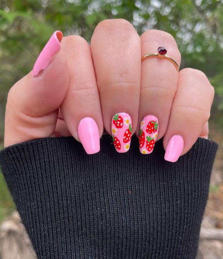 Bright bubblegum pink nails are accented with playful red strawberries and tiny white flowers. The glossy finish and simple fruit pattern create a fun, youthful look. It’s bold, cheerful, and full of summer energy.
