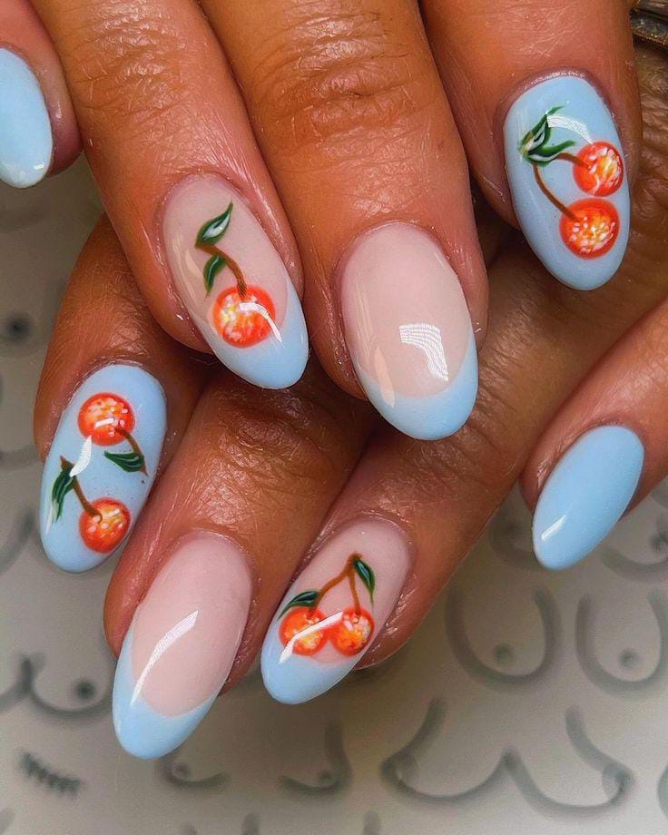 A soft blue French tip with a sheer pink base, topped with cute cherry accents. The look is clean and minimal but still playful thanks to the bright red fruit details. It gives off a breezy, effortless summer feel.
