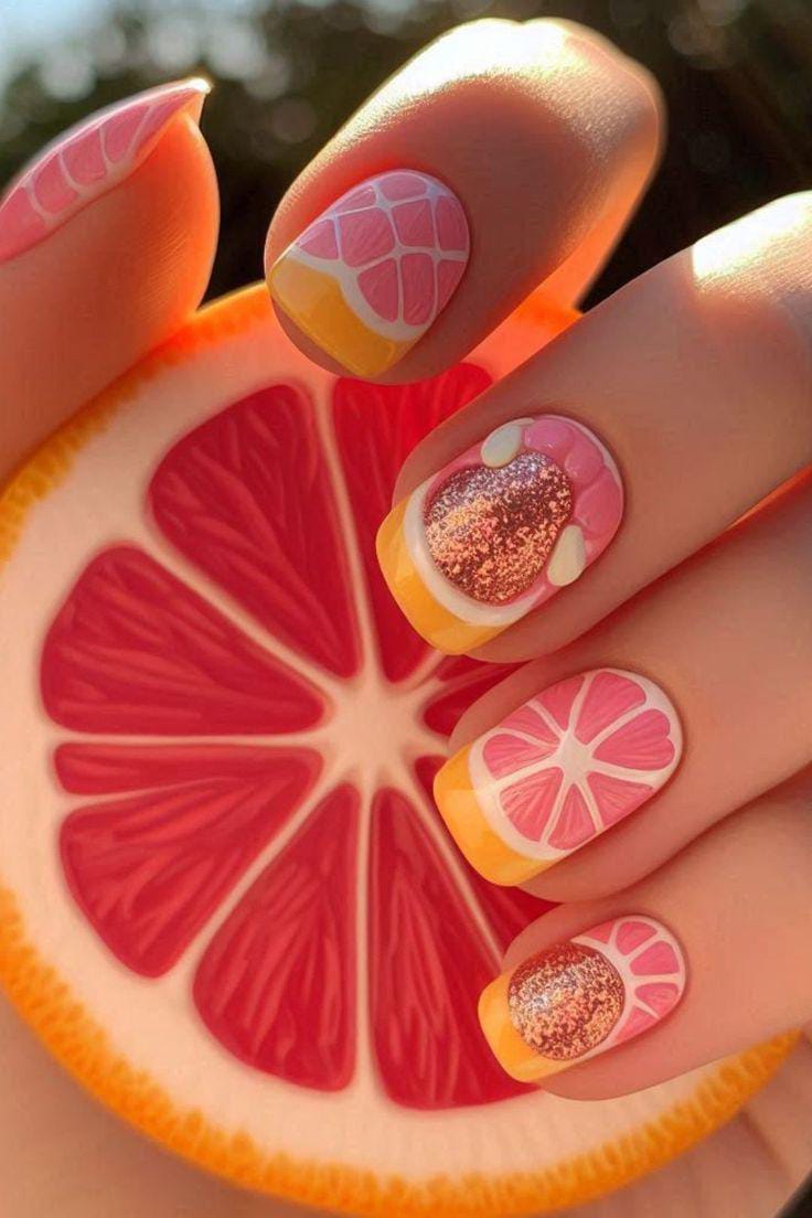 This design combines pink and grapefruit slice art with glitter, yellow tip accents for extra shine. The soft gradient background enhances the juicy fruit effect. It’s fresh, vibrant, and has a slightly glamorous summer twist.