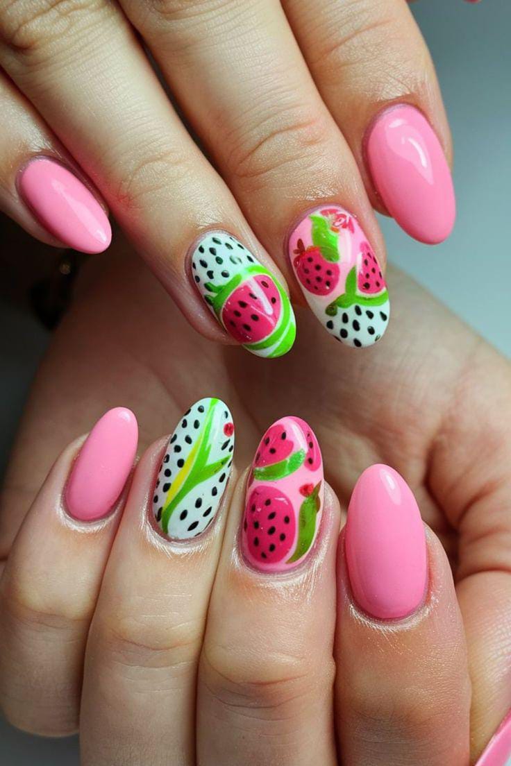 Set on a pastel pink background, this manicure mixes bright strawberries and tiny bananas for a fun, fruity summer pattern. It feels cheerful and girly, with a smooth glossy finish that makes the colors stand out.