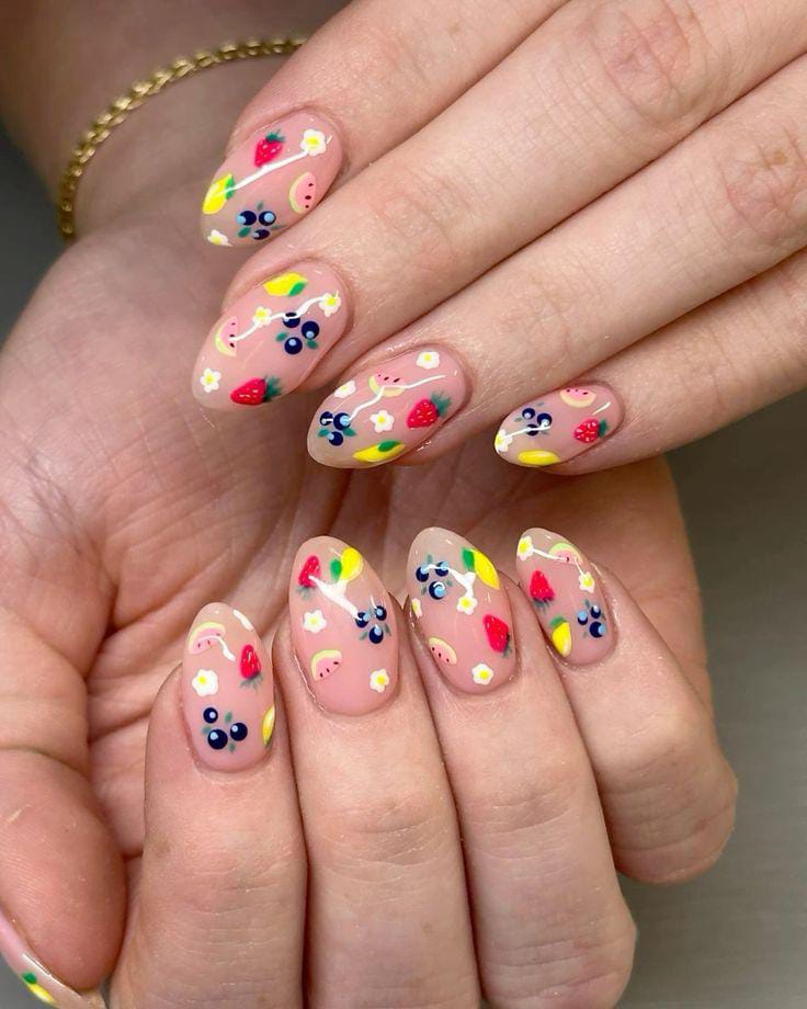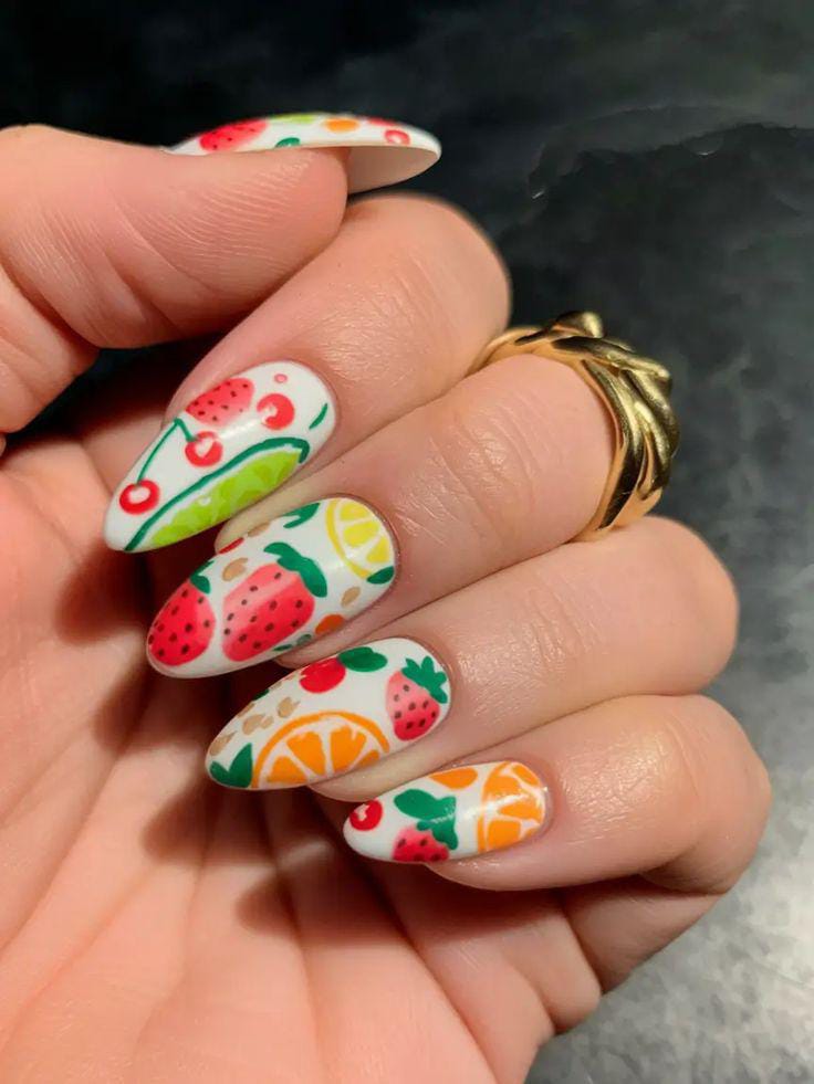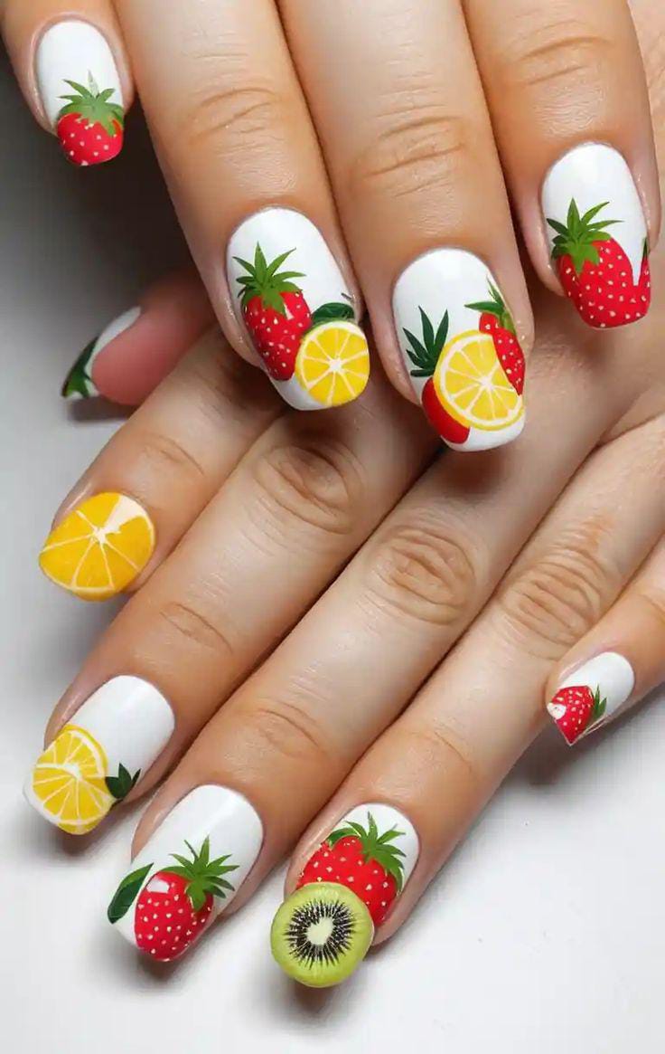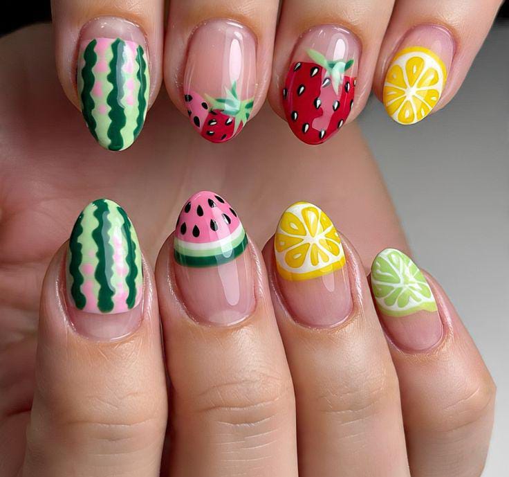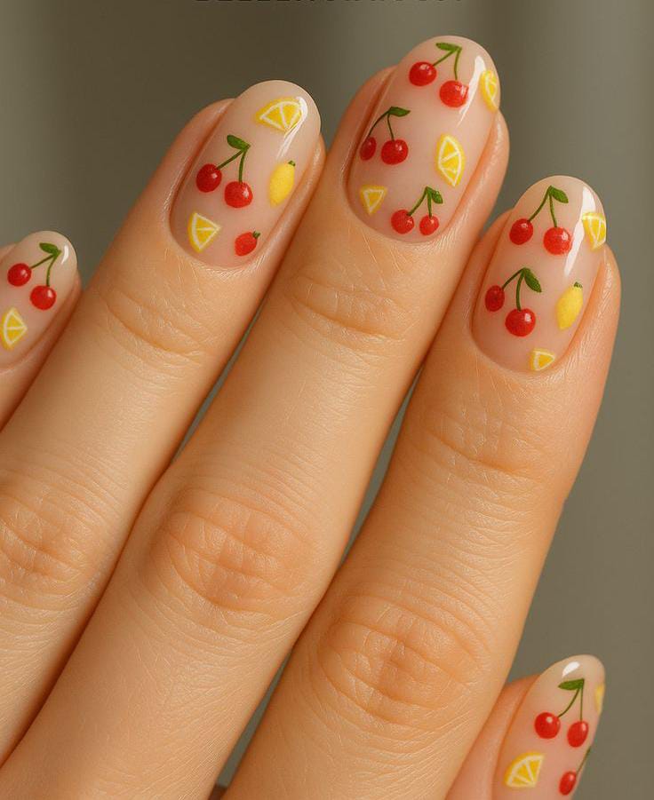 “Think tiny strawberries, juicy cherries, bright lemons, and playful watermelon slices turning your manicure into the sweetest little summer vibe.”