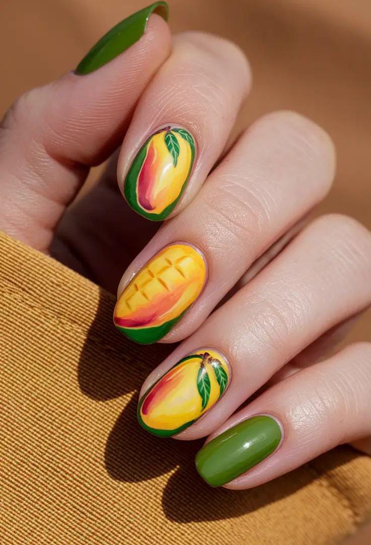 Rich green nails are paired with detailed mango artwork in warm yellow and orange tones. The glossy finish and bold color contrast give this design a lush, tropical summer feel that’s vibrant yet elegant.
