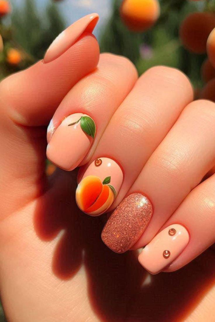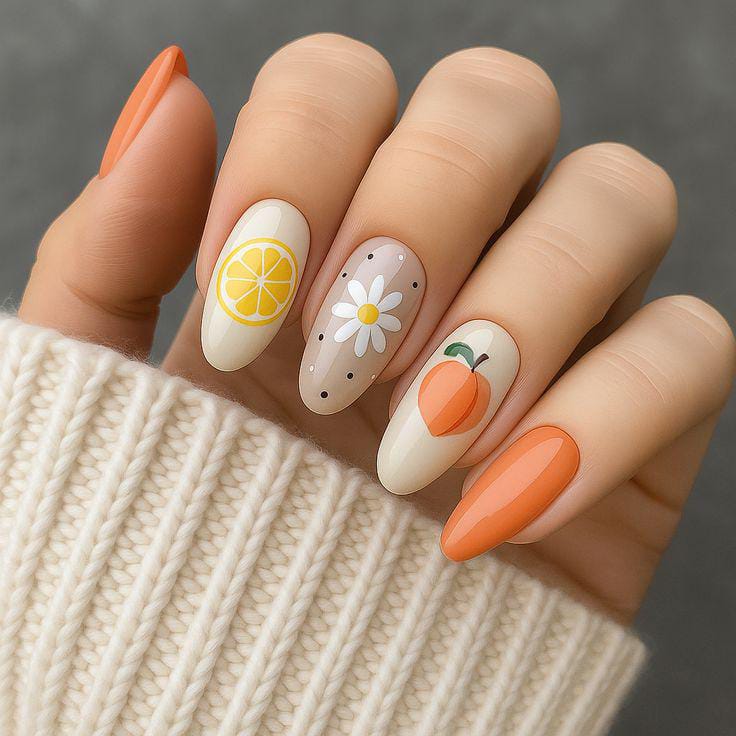 Creamy nude and orange shades are paired with lemon slices, a tiny peach design, and simple white daisy dots. The mix of fruit and floral elements gives it a soft, cottagecore summer feel. It’s light, fresh, and effortlessly pretty.