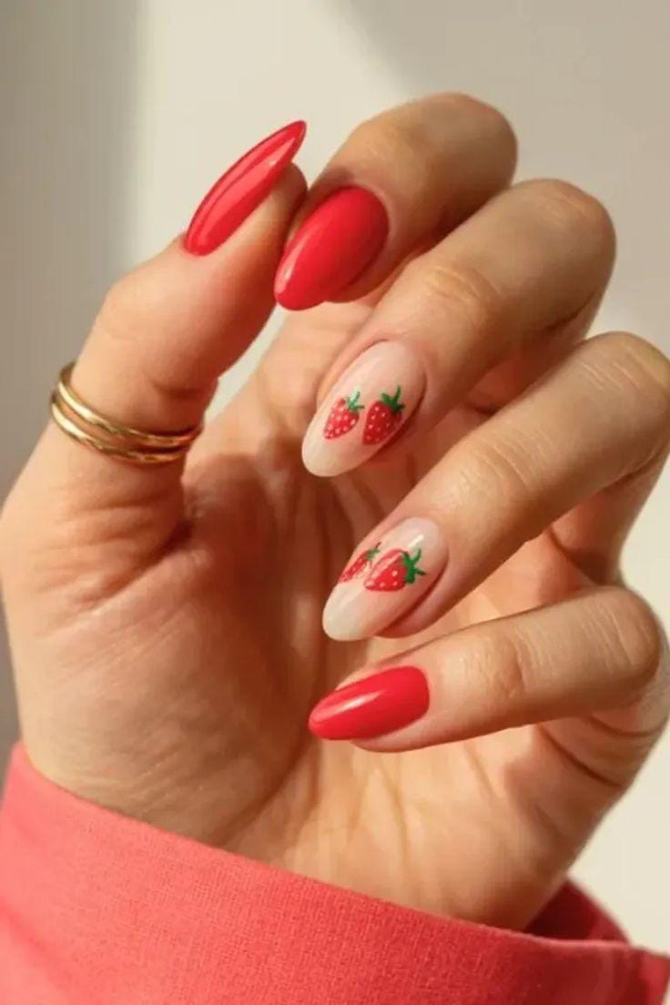 This design mixes glossy red nails with soft nude accents featuring tiny strawberry art. The almond shape and bright color palette give it a fresh, flirty summer vibe that feels both playful and polished.