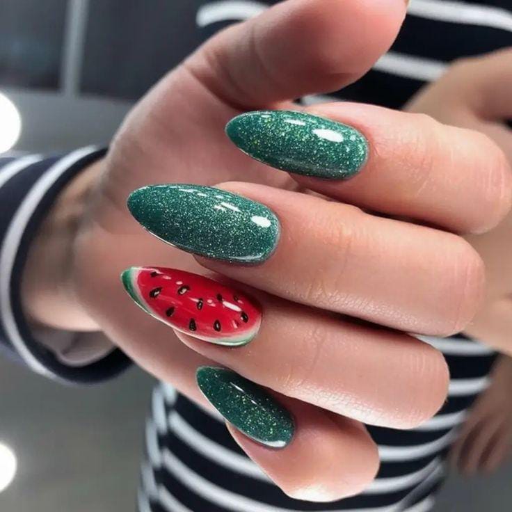 Deep green glitter nails are paired with a bold watermelon accent nail for a juicy contrast. The look is fun and vibrant, combining shimmer with fruity detail for a statement summer manicure.