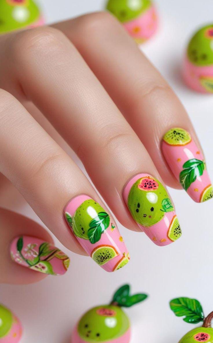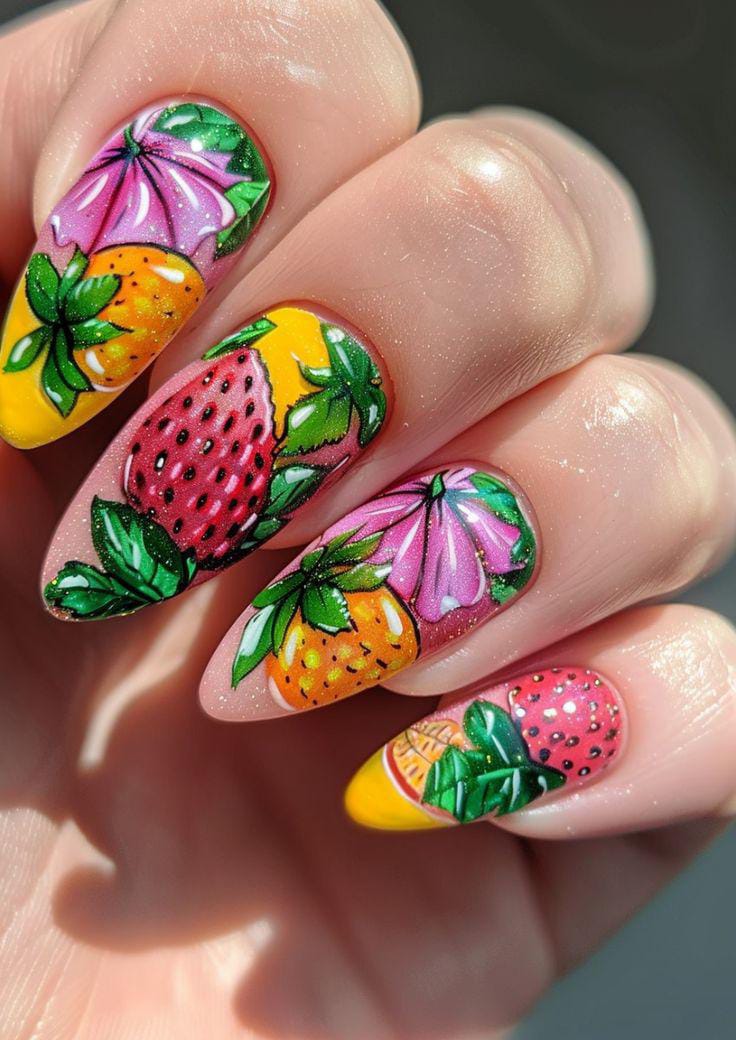 Bright, detailed fruit and leaf designs pop against a soft pink and yellow base, creating a lush tropical feel. The bold colors and glossy finish make this manicure look vibrant, playful, and full of summer warmth.