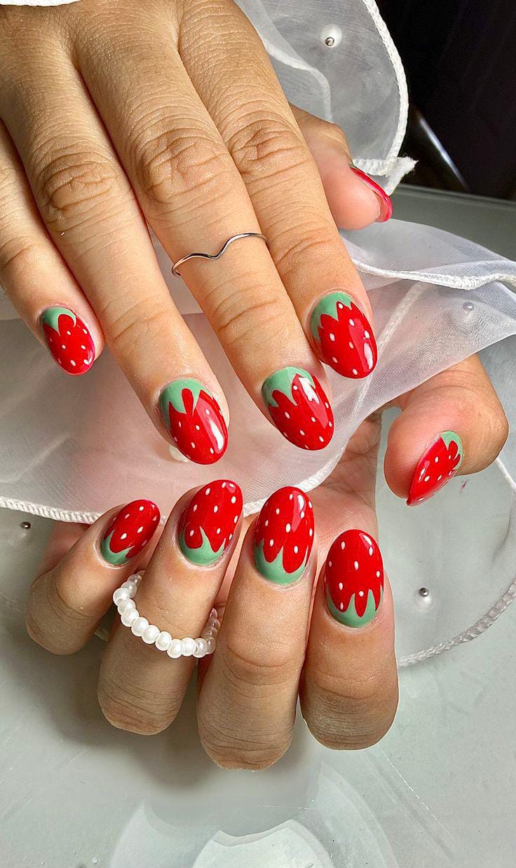 These short nails showcase red strawberry-inspired dots, with soft green accents near the cuticle. The design is simple yet adorable, giving off a sweet, youthful, and summery charm.
