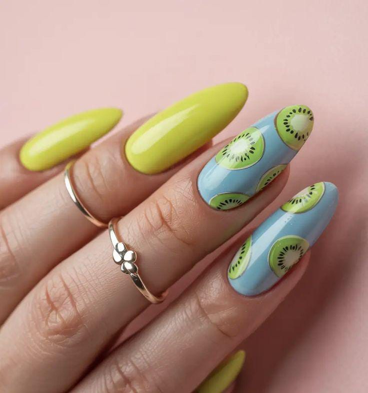 This design features bright neon green nails paired with soft blue accent nails covered in kiwi slice art. The glossy finish and bold color contrast give it a playful, tropical summer vibe.