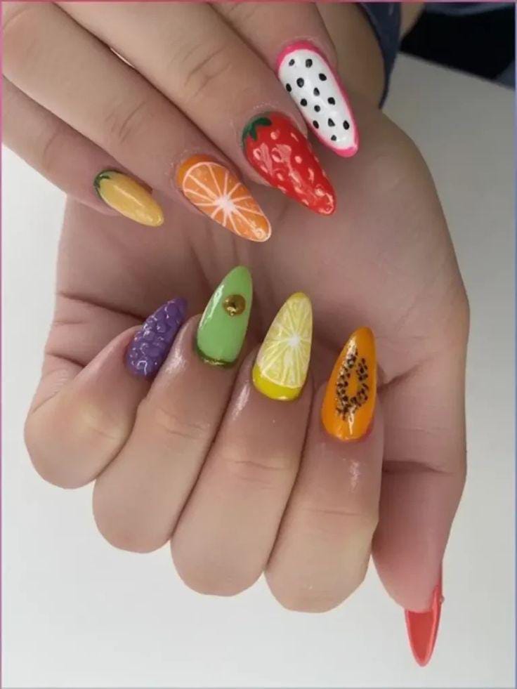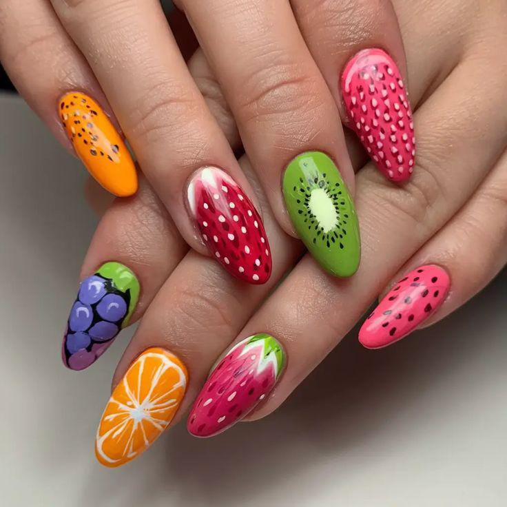 This set combines multiple fruit patterns like kiwi, strawberry, orange, and grapes across long almond-shaped nails. The bright, saturated shades and detailed artwork give it a lively, juicy, and vacation-ready summer feel.